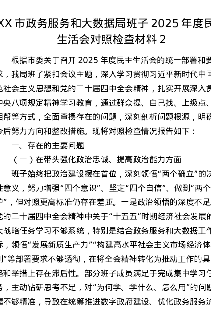 XX市政务服务和大数据局班子2025年度xxxxx对照检查材料2(五个带头)
