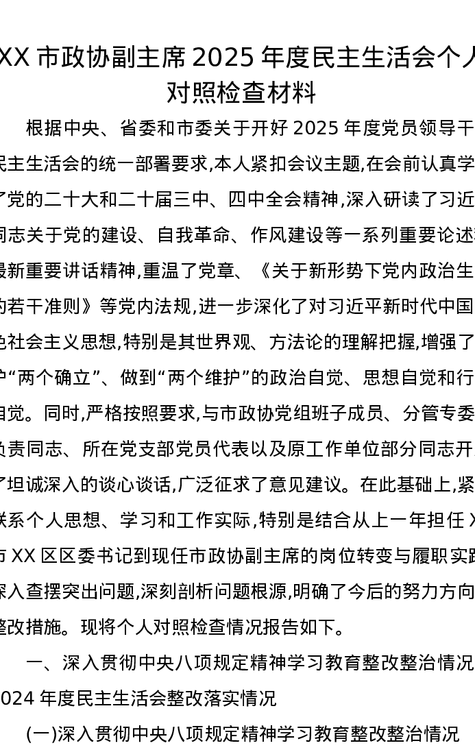 XX市政协副主席2025年度xxxxx个人对照检查材料(五个带头)