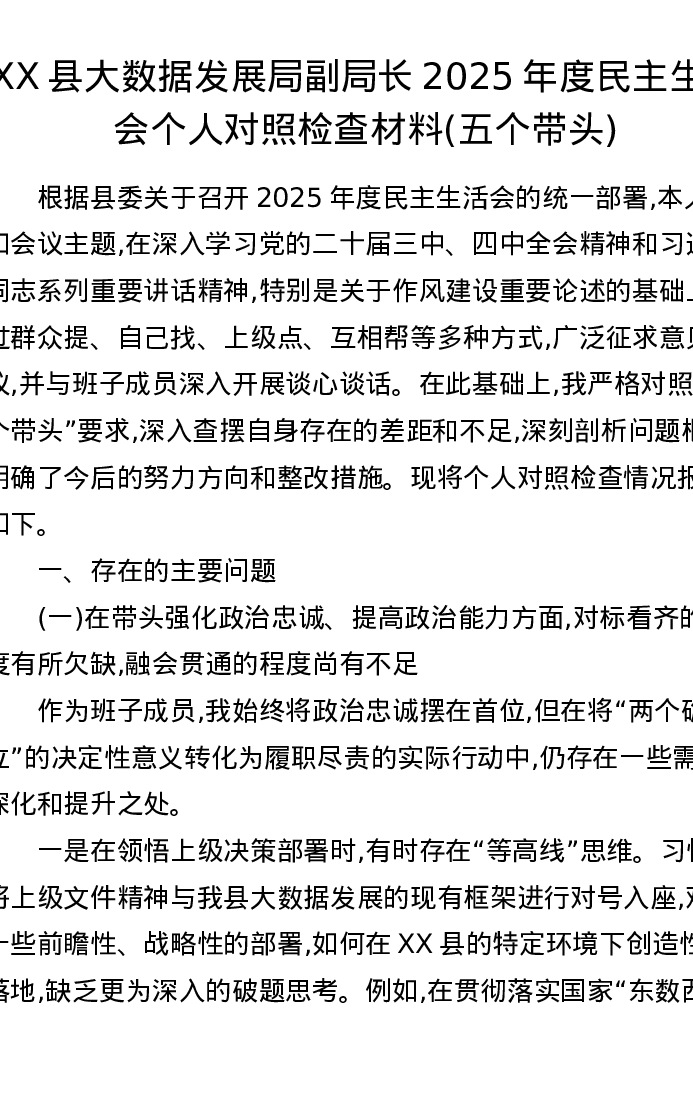 XX县大数据发展局副局长2025年度xxxxx个人对照检查材料(五个带头)