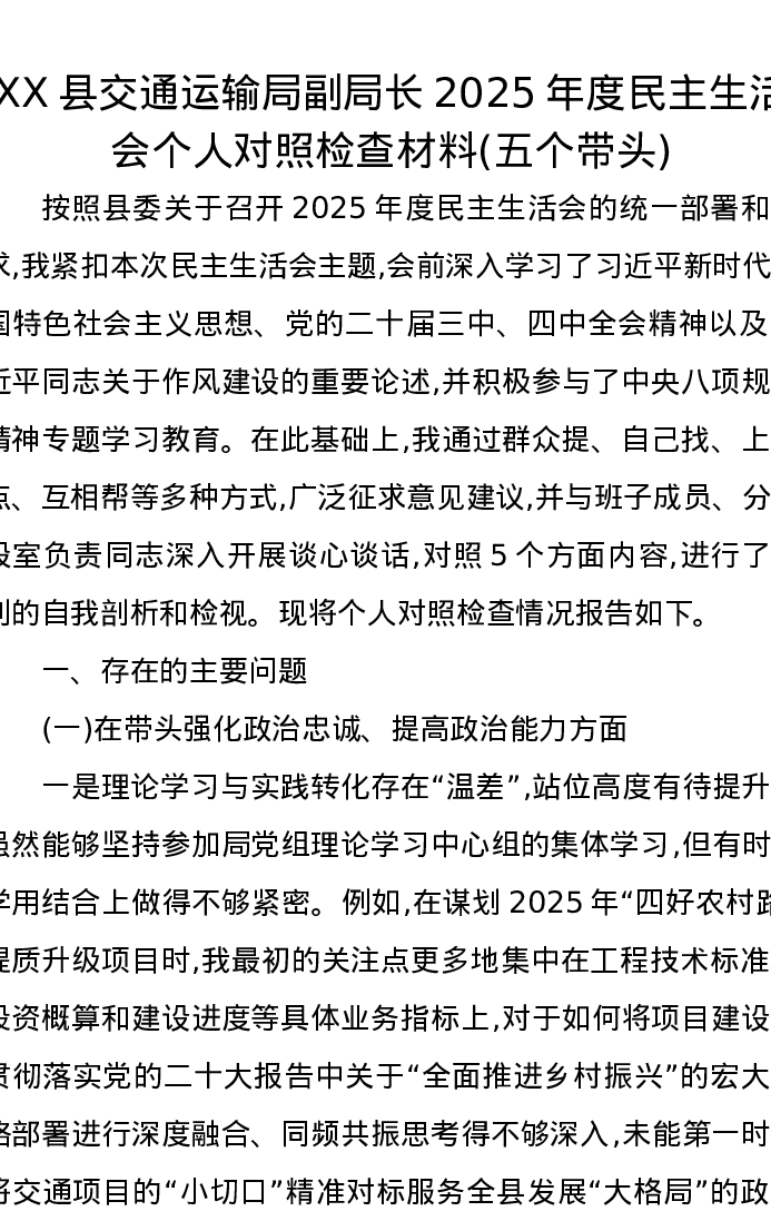 XX县交通运输局副局长2025年度xxxxx个人对照检查材料(五个带头)