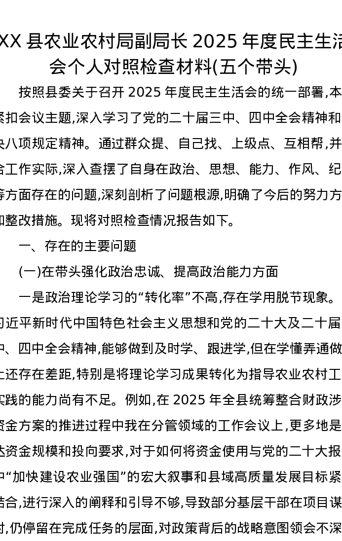XX县农业农村局副局长2025年度xxxxx个人对照检查材料(五个带头)