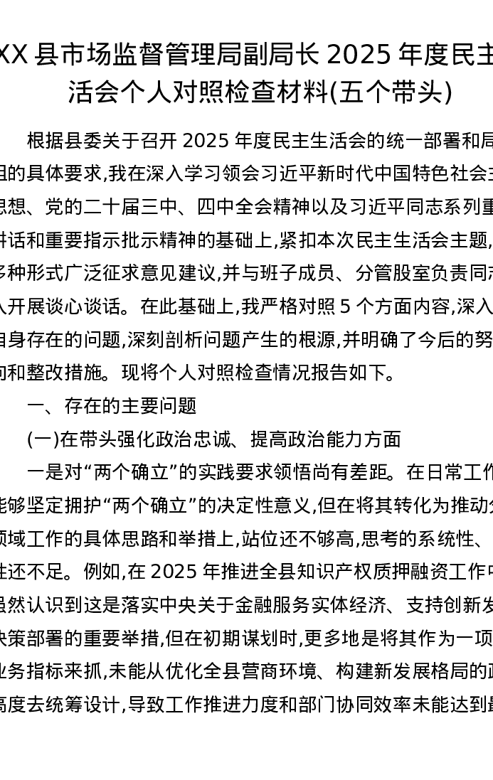 XX县市场监督管理局副局长2025年度xxxxx个人对照检查材料(五个带头)