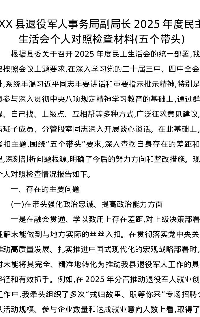 XX县退役军人事务局副局长2025年度xxxxx个人对照检查材料(五个带头)