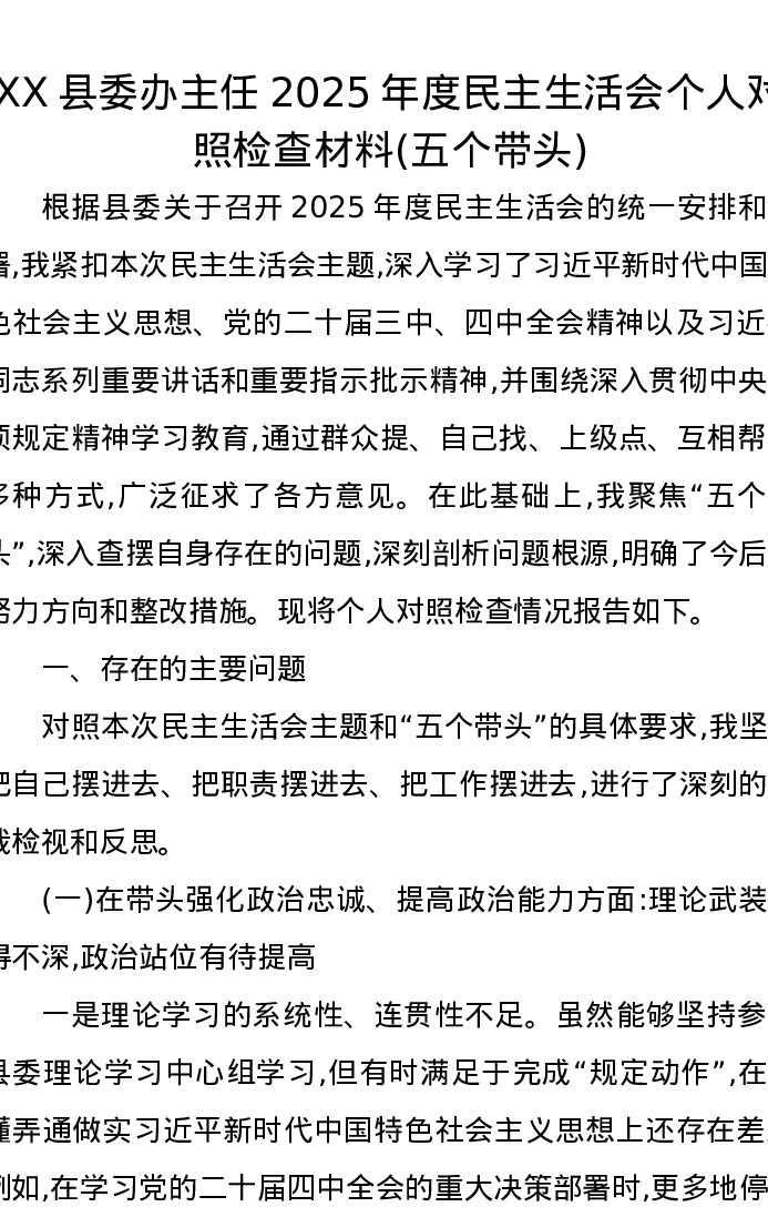 XX县委办主任2025年度xxxxx个人对照检查材料(五个带头)