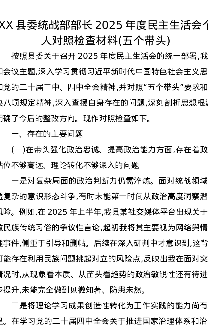 XX县委统战部部长2025年度xxxxx个人对照检查材料(五个带头)
