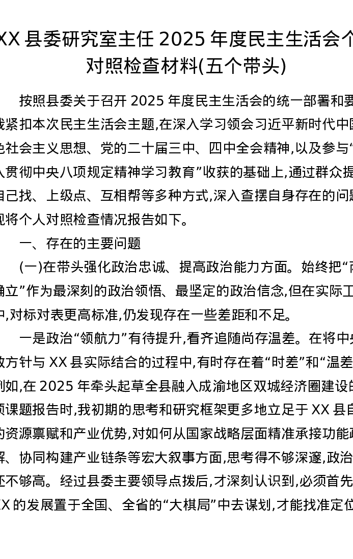 XX县委研究室主任2025年度xxxxx个人对照检查材料(五个带头)