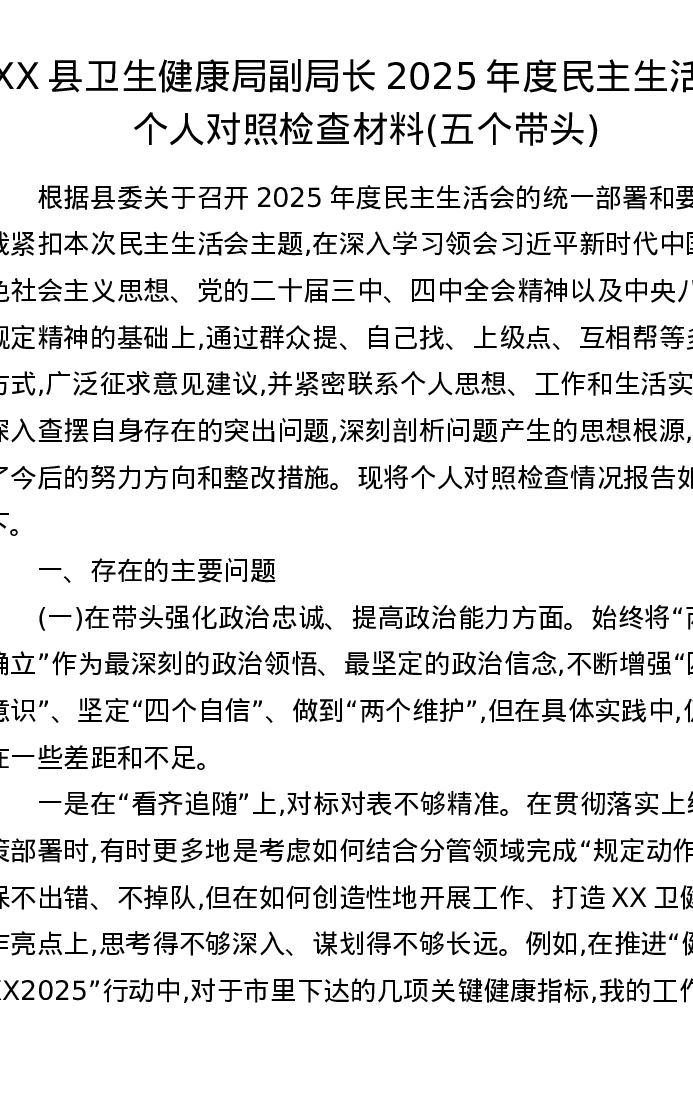 XX县卫生健康局副局长2025年度xxxxx个人对照检查材料(五个带头)