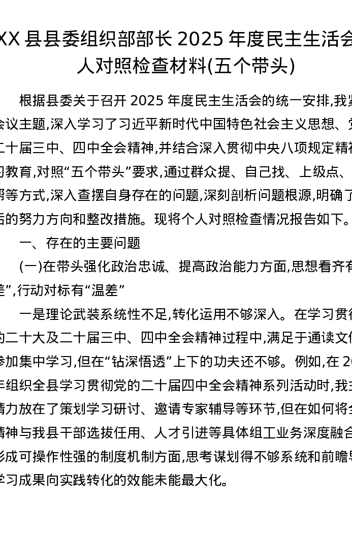 XX县县委组织部部长2025年度xxxxx个人对照检查材料(五个带头)