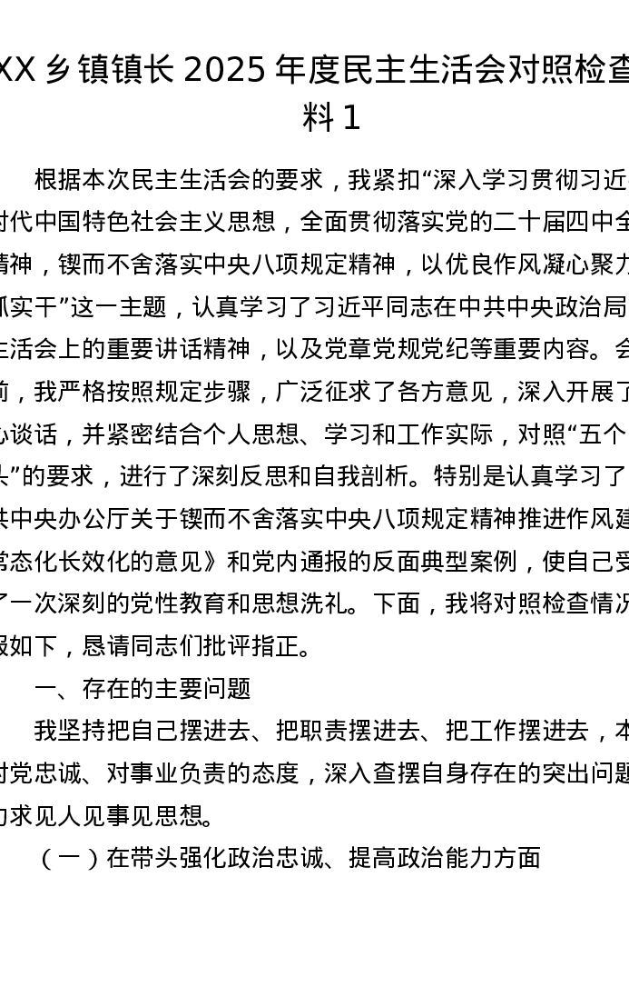XX乡镇镇长2025年度xxxxx对照检查材料1(五个带头)