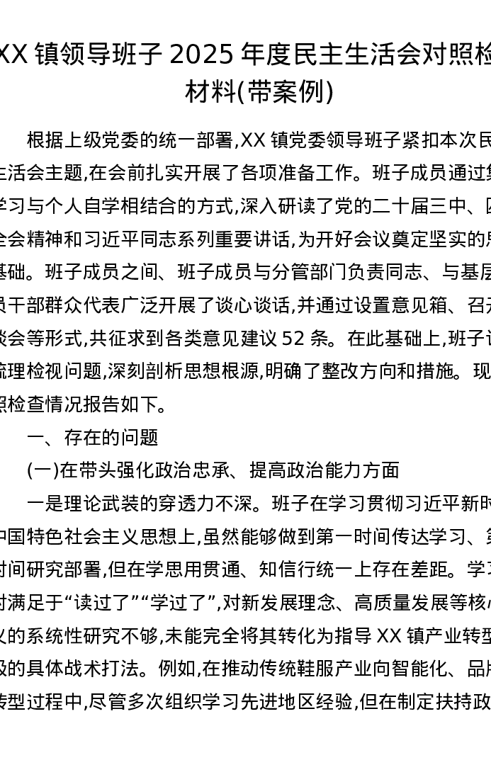 XX镇领导班子2025年度xxxxx对照检查材料(带案例)(五个带头)