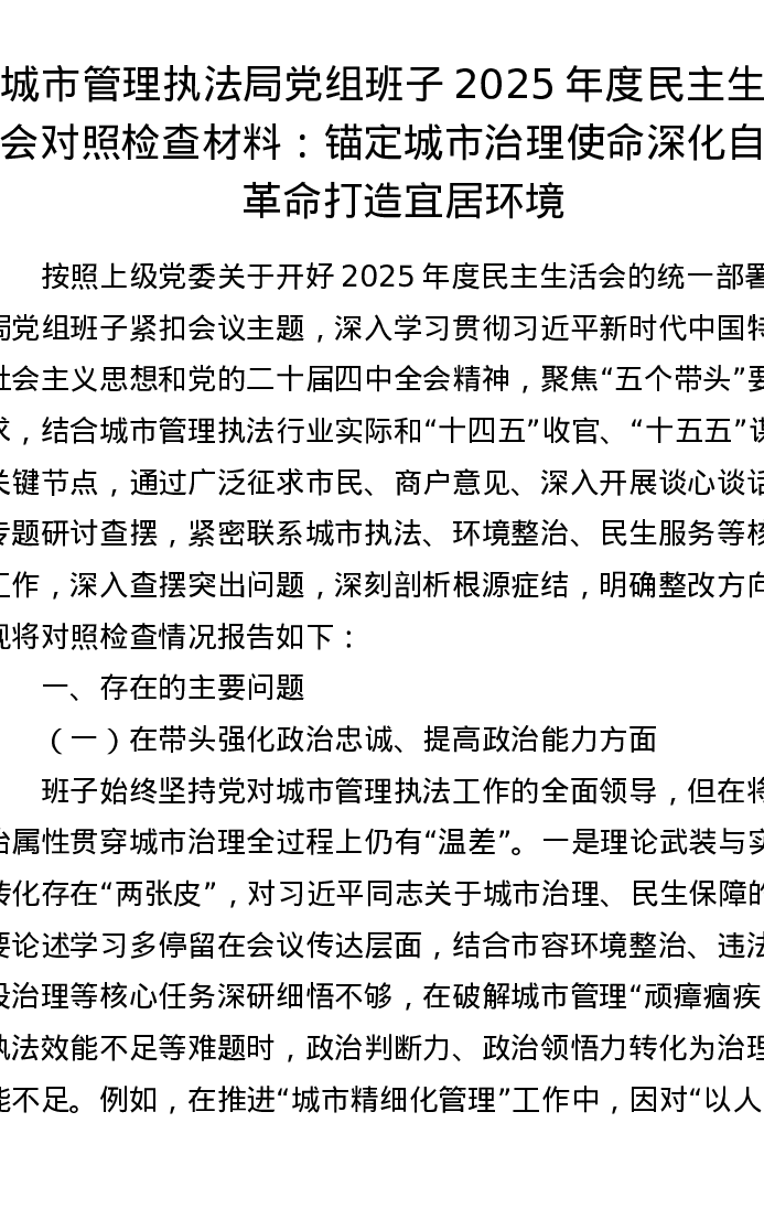 城市管理执法局党组班子2025年度五个带头xxxxx对照检查材料:锚定城市治理使命 深化自我革命 打造宜居环境