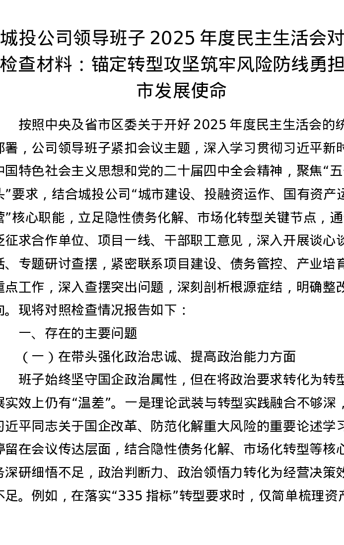 城投公司领导班子2025年度五个带头xxxxx对照检查材料:锚定转型攻坚 筑牢风险防线 勇担城市发展使命