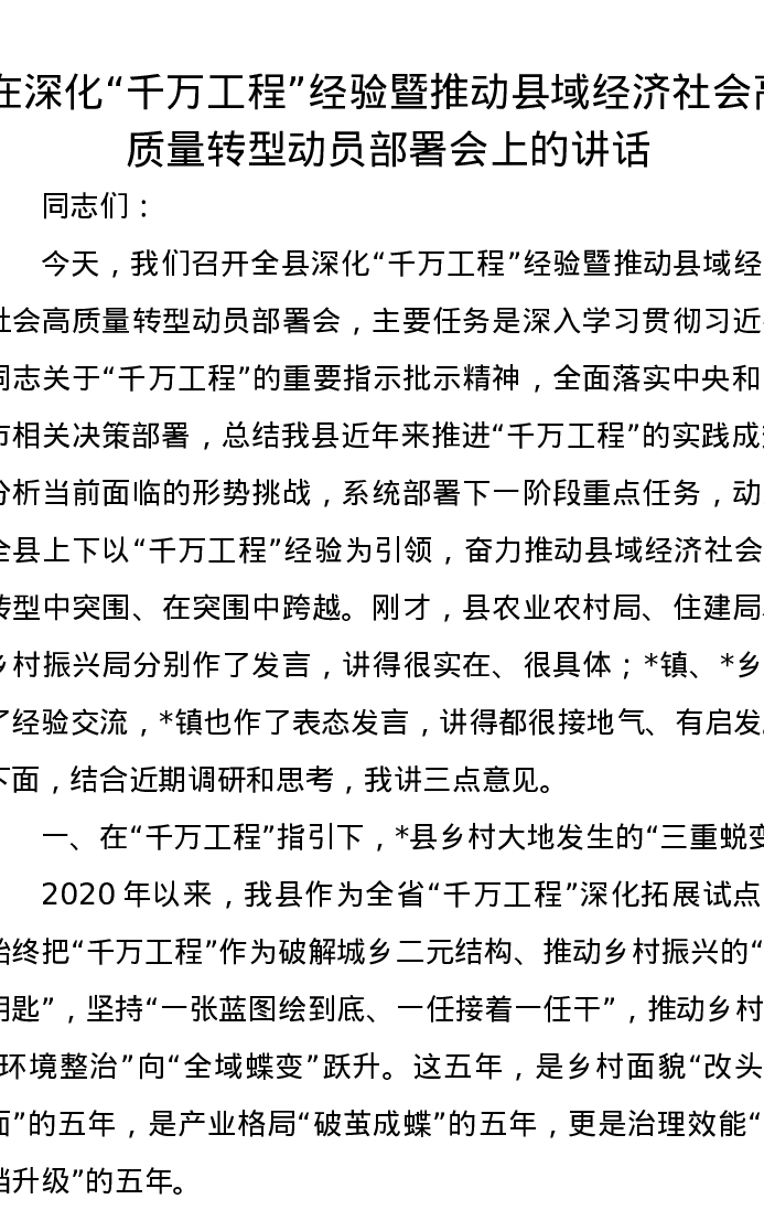 在深化千万工程经验暨推动县域经济社会高质量转型动员部署会上的讲话
