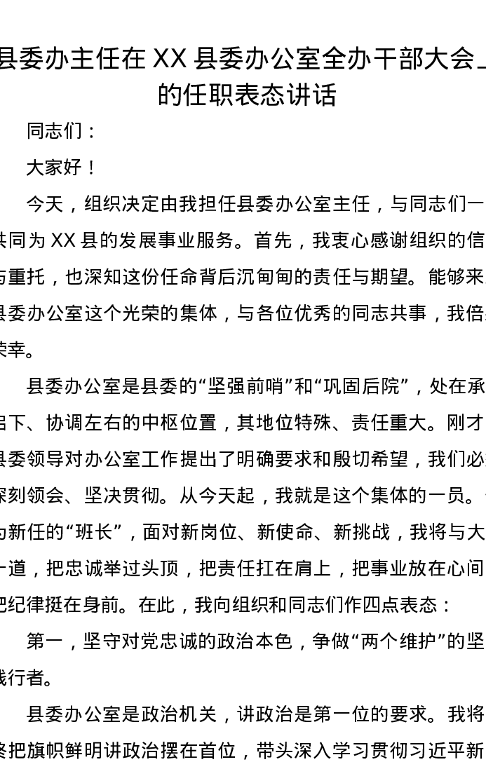 县委办主任在XX县委办公室全办干部大会上的任职表态讲话
