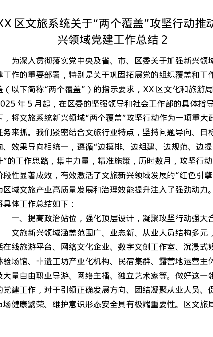 XX区文旅系统关于两个覆盖攻坚行动推动新兴领域党建工作总结2