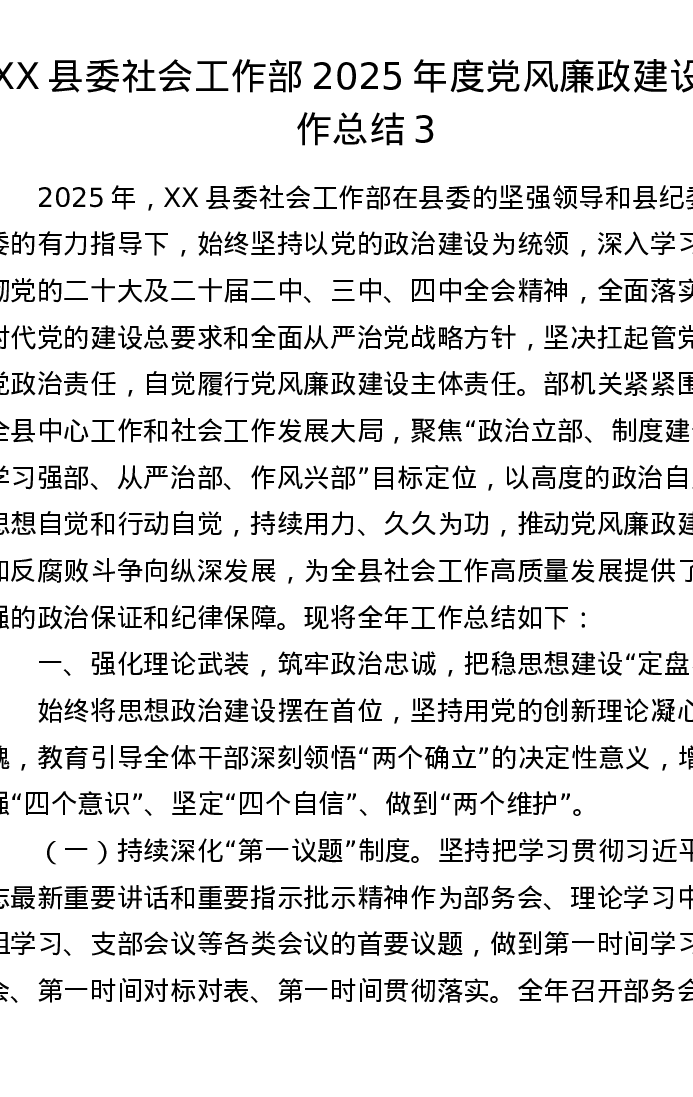 XX县委社会工作部2025年度党风廉政建设工作总结3