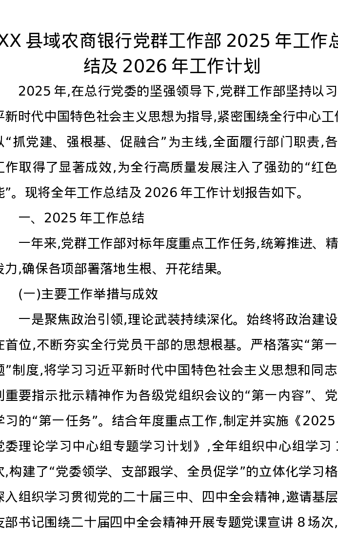 XX县域农商银行党群工作部2025年工作总结及2026年工作计划