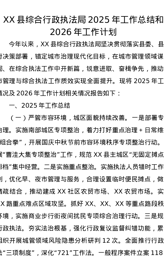 XX县综合行政执法局2025年工作总结和2026年工作计划