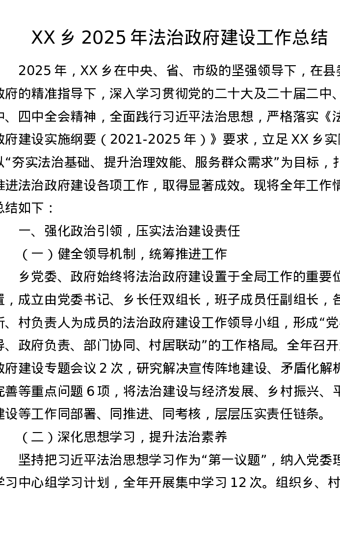 XX乡2025年法治政府建设工作总结