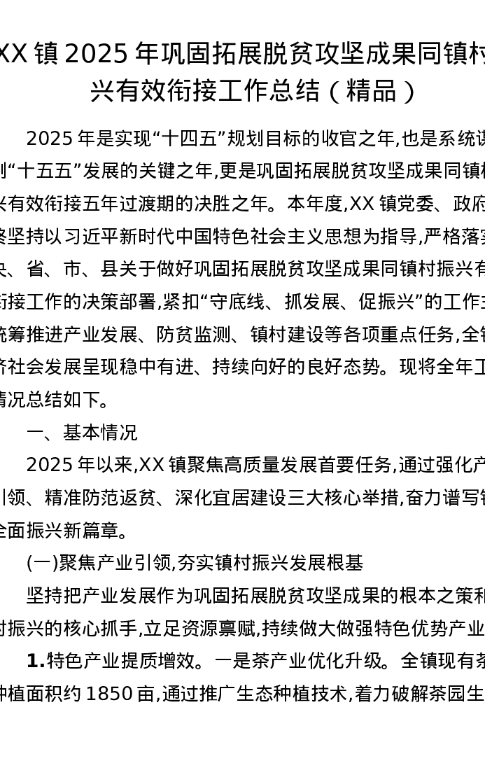 XX镇2025年巩固拓展脱贫攻坚成果同镇村振兴有效衔接工作总结