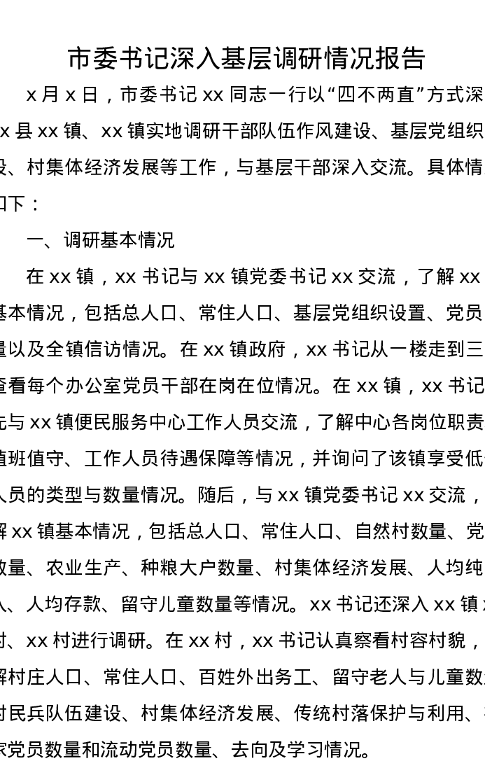 市委书记深入基层调研情况报告