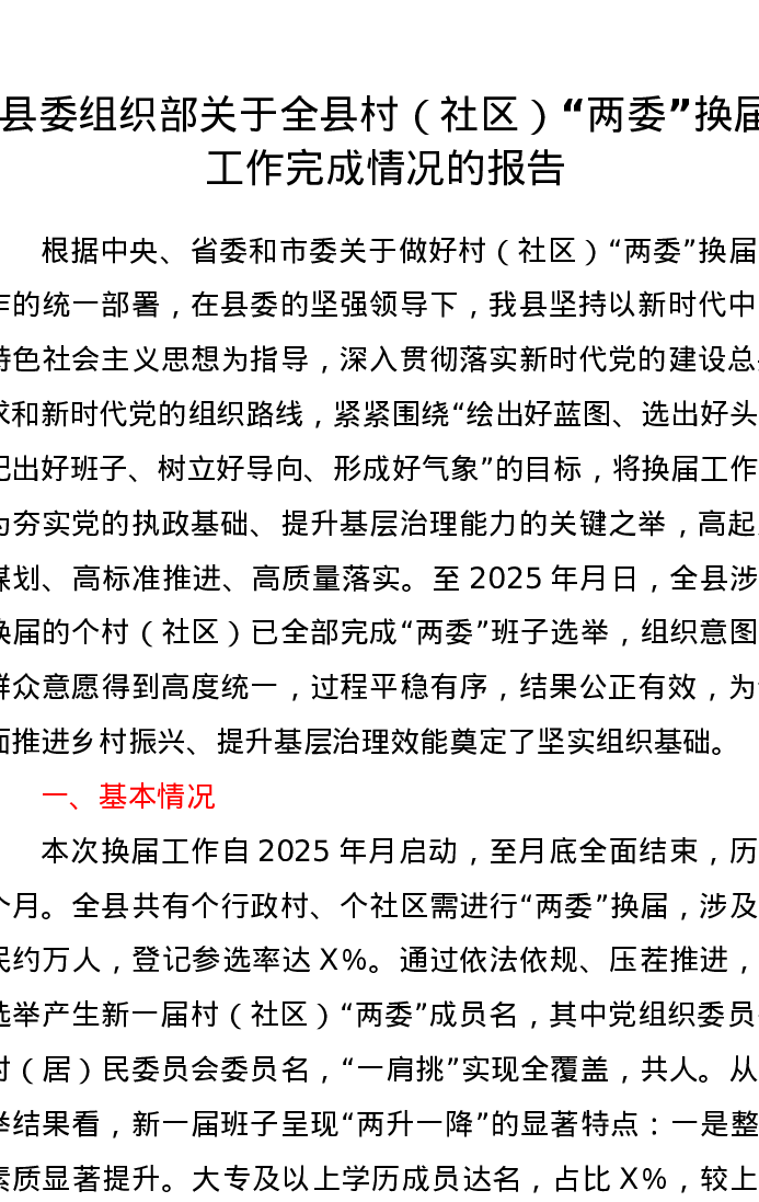 县委组织部关于全县村(社区)两委换届工作完成情况的报告