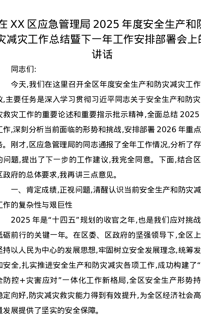 在XX区应急管理局2025年度安全生产和防灾减灾工作总结暨下一年工作安排部署会上的讲话