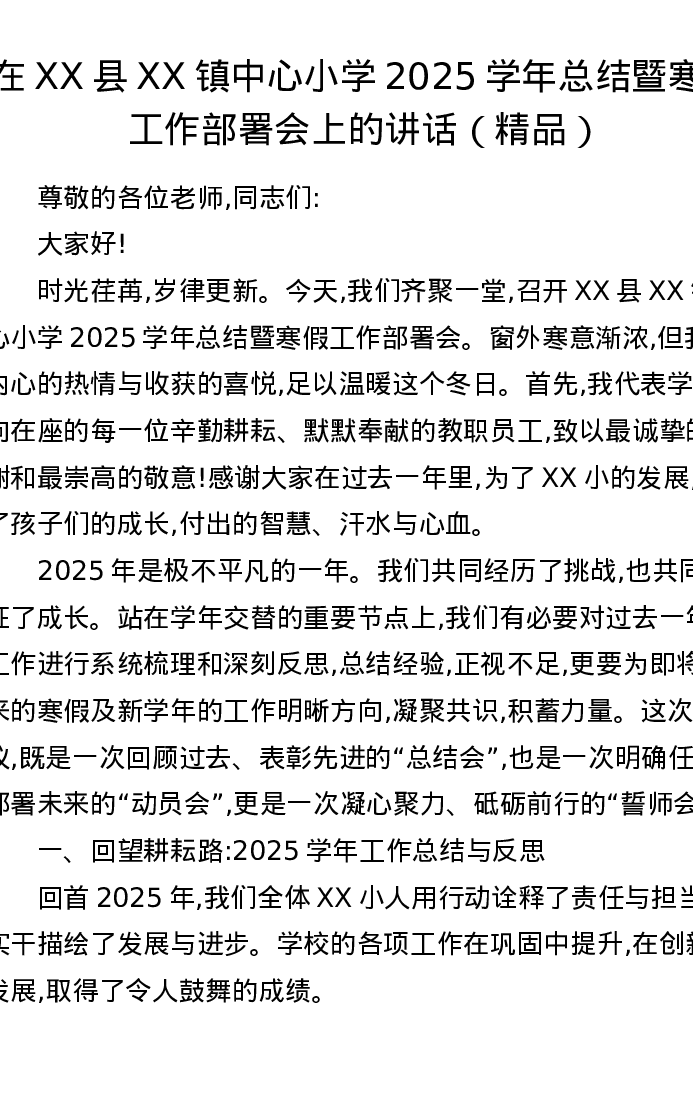 在XX县XX镇中心小学2025学年总结暨寒假工作部署会上的讲话