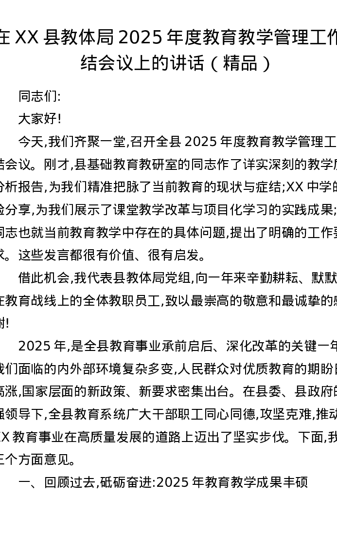 在XX县教体局2025年度教育教学管理工作总结会议上的讲话