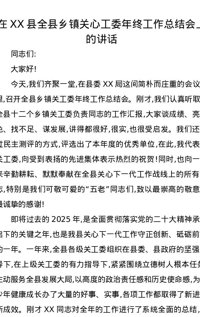 在XX县全县乡镇关心工委年终工作总结会上的讲话