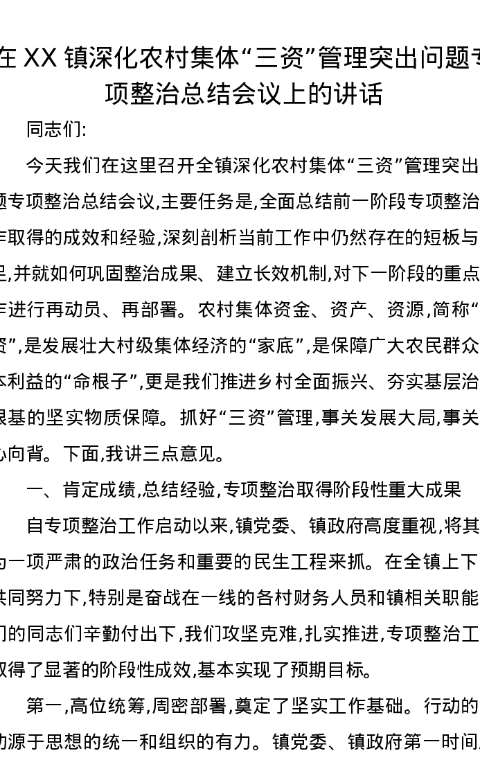 在XX镇深化农村集体三资管理突出问题专项整治总结会议上的讲话