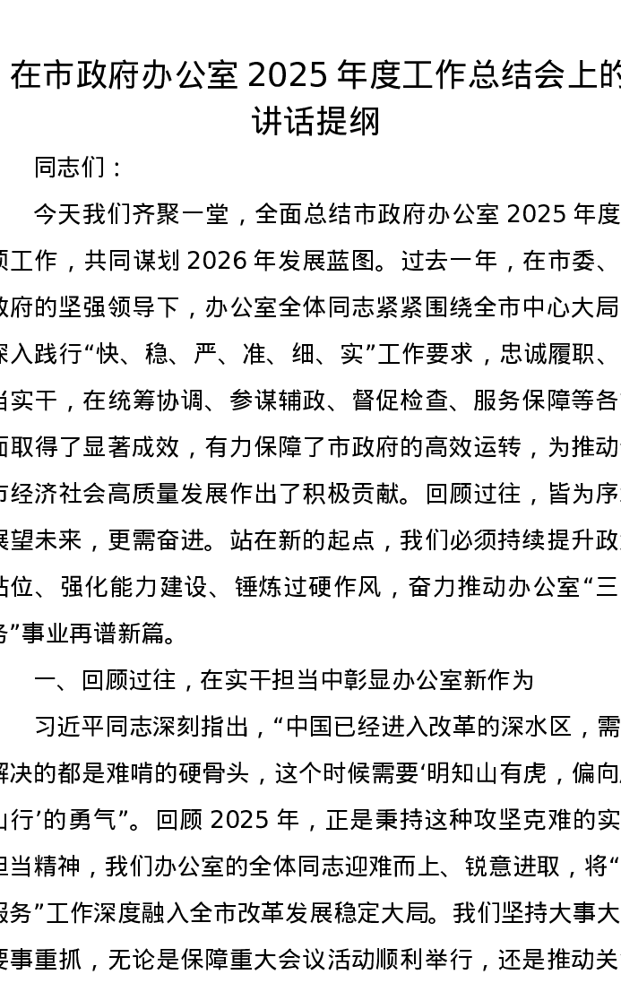 在市政府办公室2025年度工作总结会上的讲话提纲