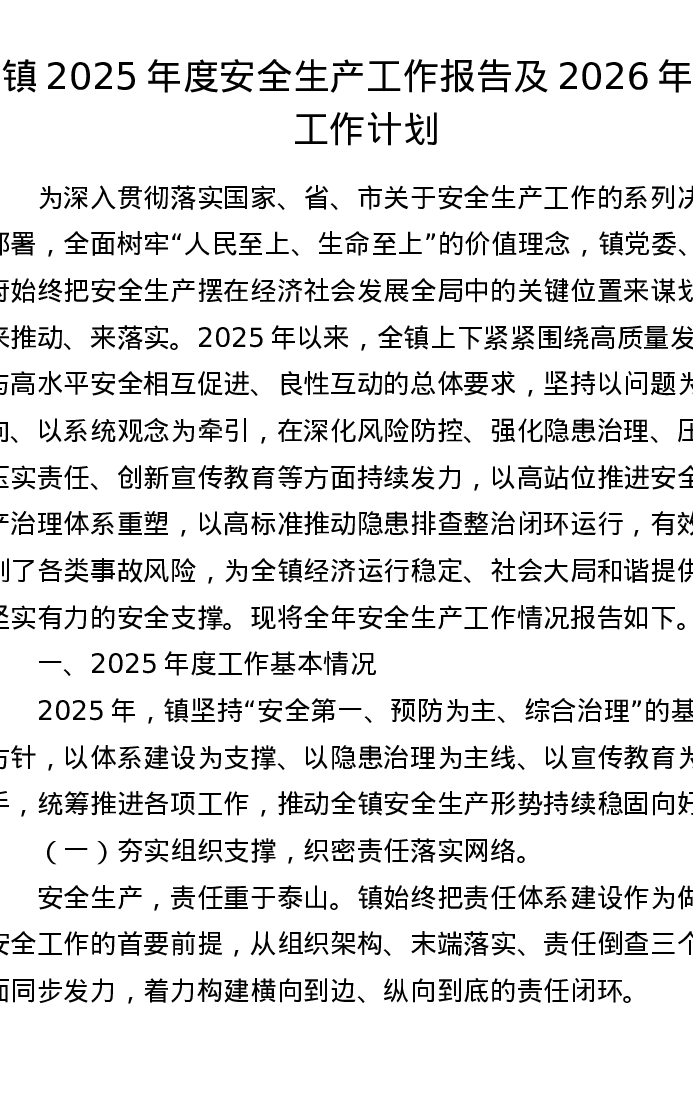 镇2025年度安全生产工作报告及2026年度工作计划(4425字)