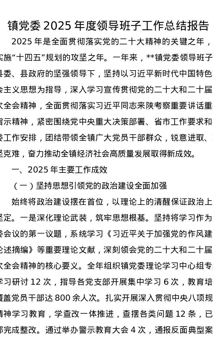 镇党委2025年度领导班子工作总结报告