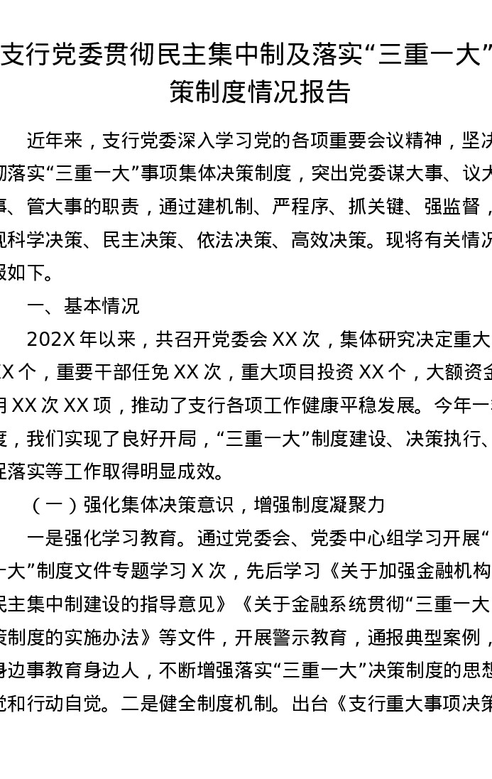 支行党委贯彻民主集中制及落实 三重一大 决策制度情况报告