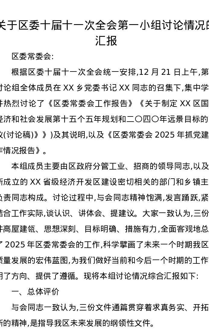 关于区委十届十一次全会第一小组讨论情况的汇报