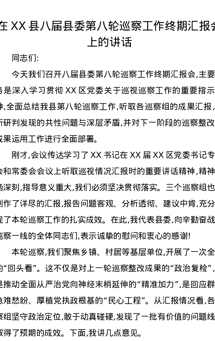 在XX县八届县委第八轮巡察工作终期汇报会上的讲话