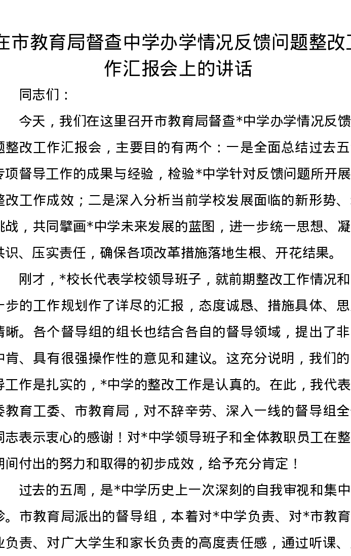 在市教育局督查中学办学情况反馈问题整改工作汇报会上的讲话