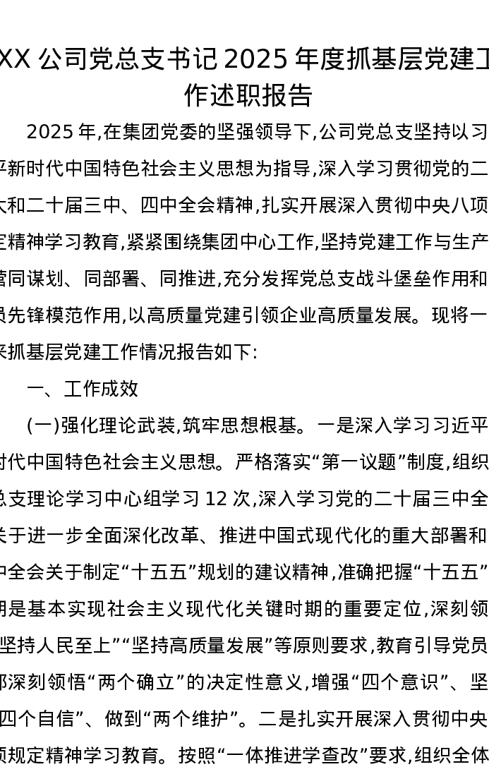 XX公司党总支书记2025年度抓基层党建工作述职报告