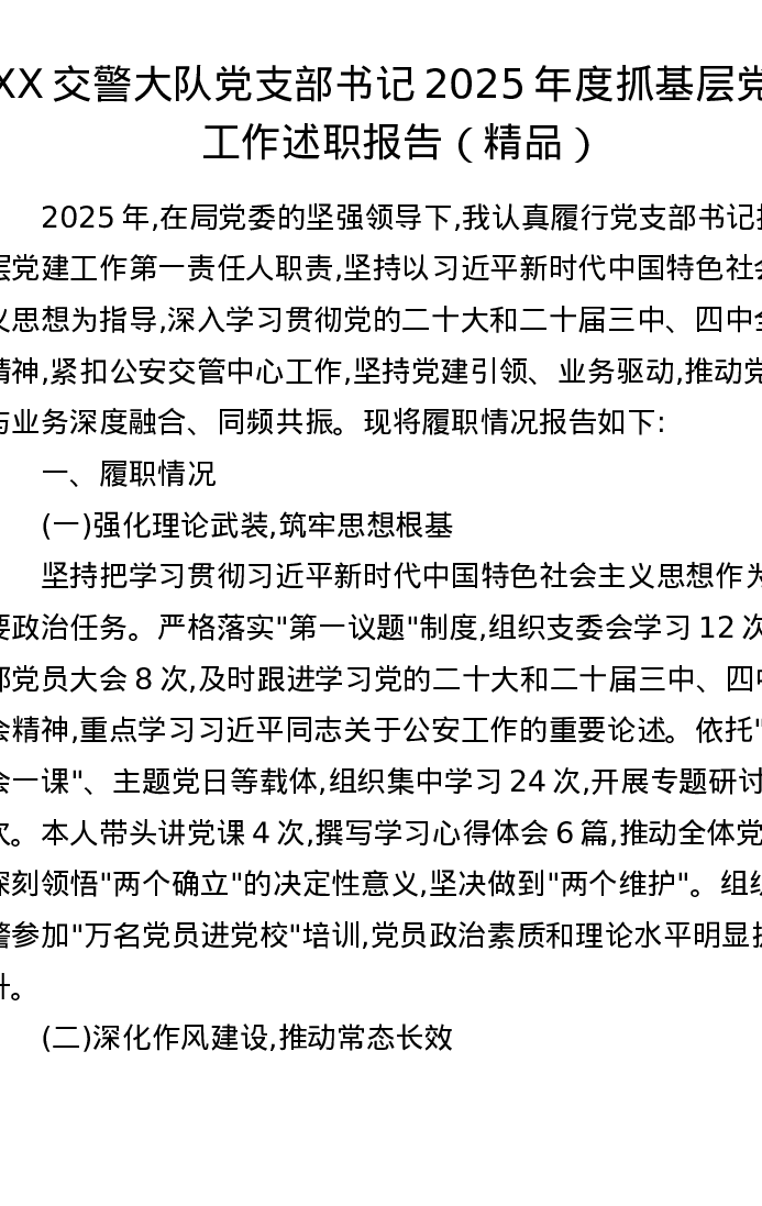 XX交警大队党支部书记2025年度抓基层党建工作述职报告
