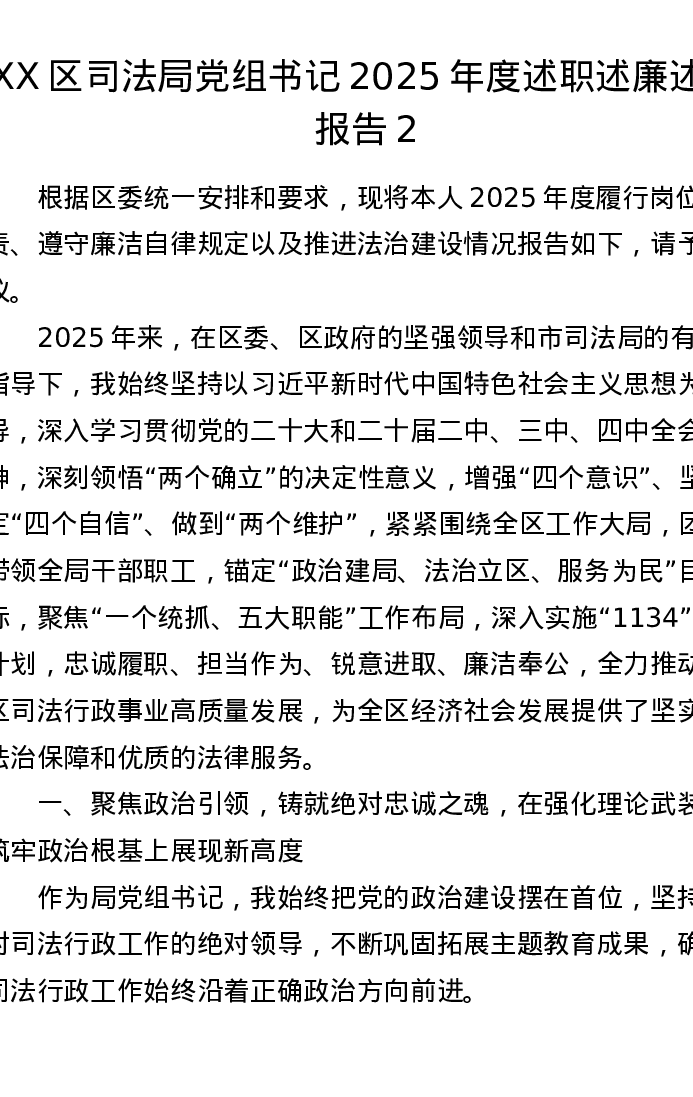 XX区司法局党组书记2025年度述职述廉述法报告2
