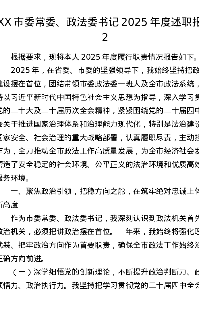 XX市委常委、政法委书记2025年度述职报告2