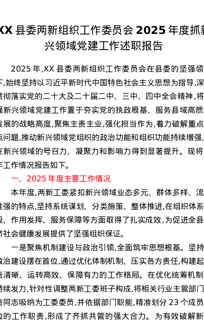 XX县委两新组织工作委员会2025年度抓新兴领域党建工作述职报告