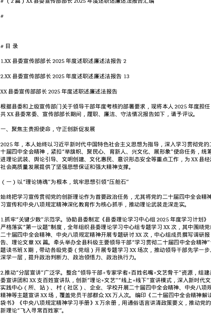XX县委宣传部部长2025年度述职述廉述法报告2篇