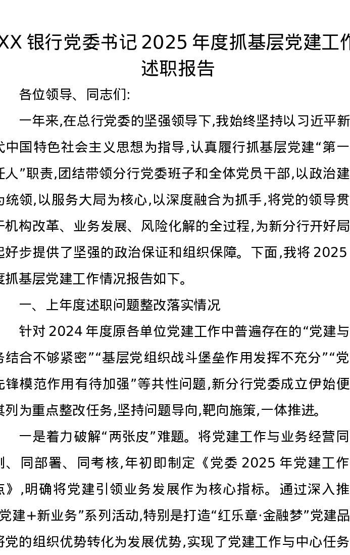 XX银行党委书记2025年度抓基层党建工作述职报告