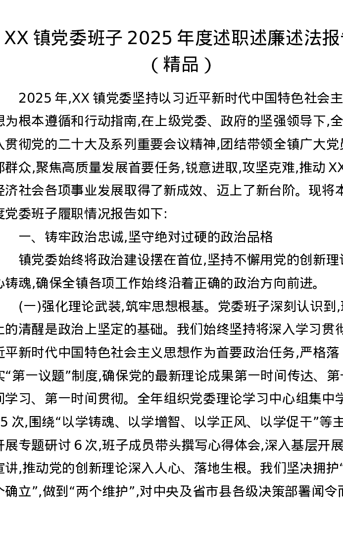XX镇党委班子2025年度述职述廉述法报告
