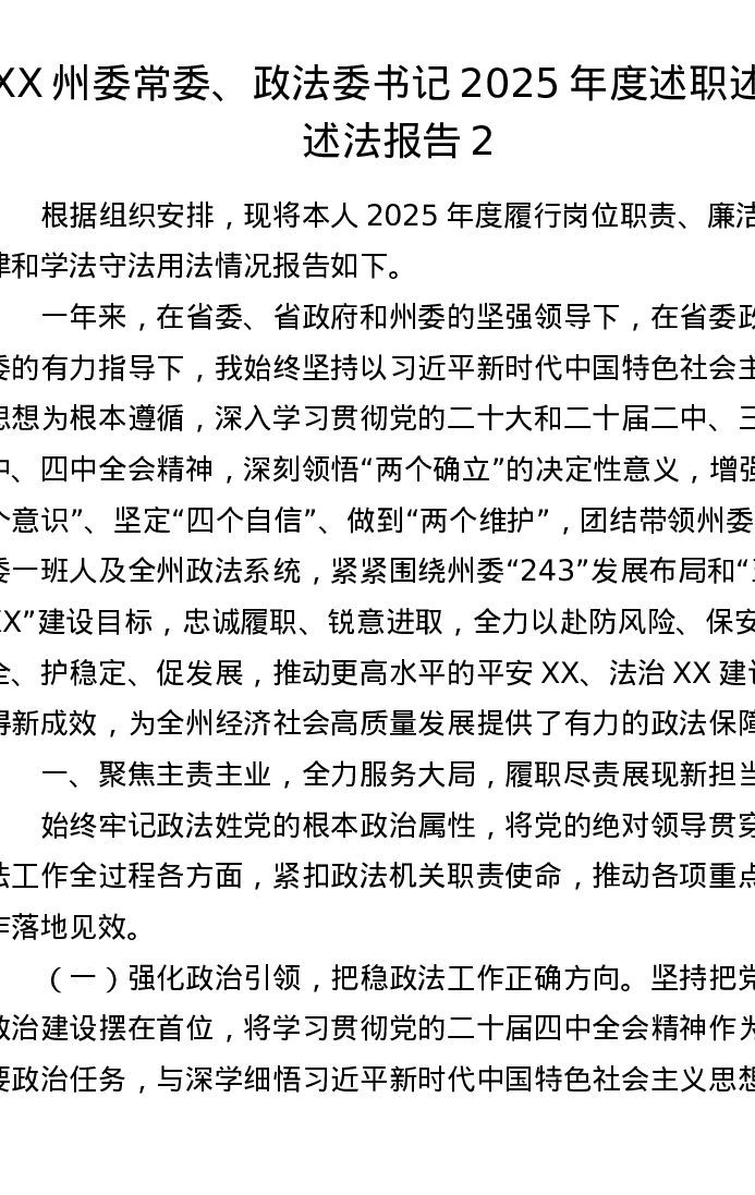 XX州委常委、政法委书记2025年度述职述廉述法报告2