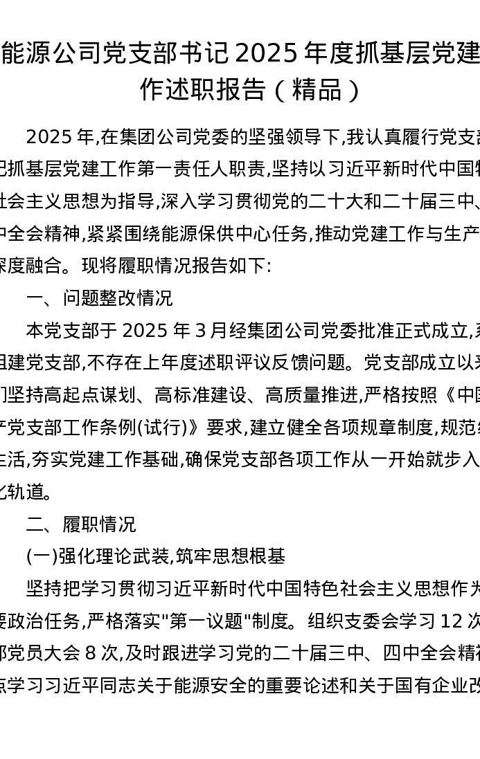 能源公司党支部书记2025年度抓基层党建工作述职报告