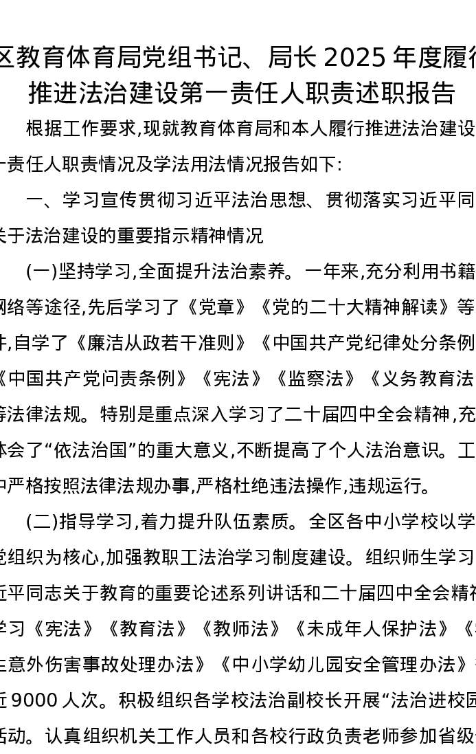 区教育体育局党组书记、局长2025年度履行推进法治建设第一责任人职责述职报告