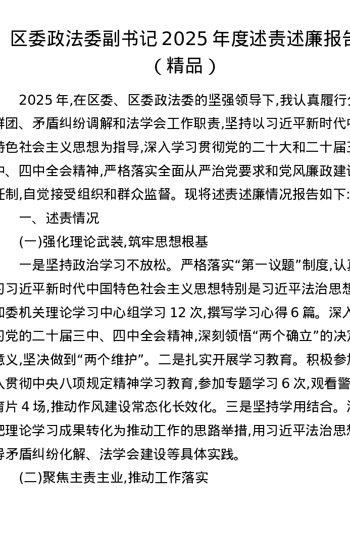 区委政法委副书记2025年度述责述廉报告